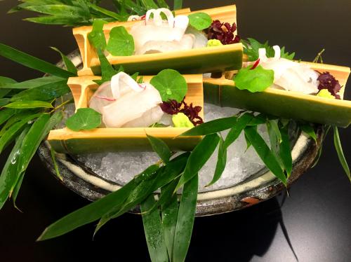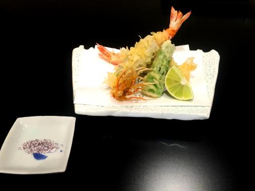 【落語食堂】まぐろつけ焼き/鱸の洗い/車海老変わり天ぷら(菊江仏壇)