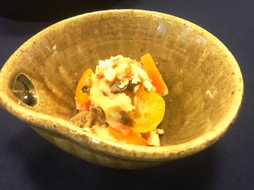 【落語食堂】鮎素揚げ筮竹たで味噌敷き/八景和え/鱒の膳所焼き 紅梅蕪(近江八景)