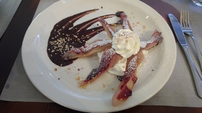 また、トラットリアでのデザートには「ペーラ・コッタ・アッロ・シロッポ・ディ・バローロ Pera cotta allo scioroppo di barolo(洋梨のバローロ・シロップがけ)」があり、注文してみました。