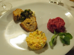 ロシア風サラダ(真ん中)、仔牛肉のタルタル(右上)