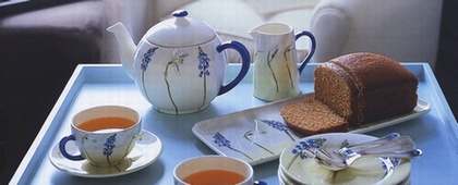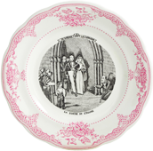 『ポントシュー』シリーズ。18世紀のポントシュー陶器(注11)を模したデザイン。白くシンプルな印象ですが、アンティーク調の縁のデザインがとても美しく、素朴な焼き菓子が一気に上品に見えます。