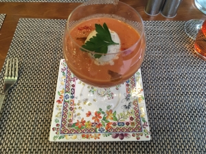 ジアンの街にあるホテル・レストラン『ホテル・ラ・プーラルド Hôtel la Poularde』は、リーズナブルなのにボリュームがあり美味しい料理で連日盛況の人気店です。ジアンの皿は位置皿(注8)、リエット、ガスパチョ、チーズ、デザートなど、コースのあらゆる場面で登場しました。