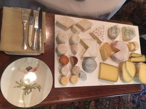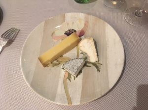 食事の締めくくりに欠かせないチーズのサーヴィスにもジアンの皿が使われていました。落ち着いた色合いで描かれたアネモネの花が、盛り付けられたチーズを引き立てています。