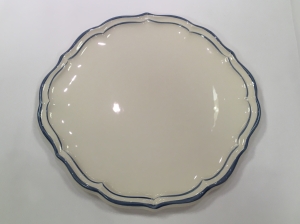 ひとくちに陶磁器と言ってもフランスにはさまざまな産地があり、それぞれに特徴があります。たとえばブルターニュのカンペール焼き (注1)は独特なタッチの花と民族衣装姿の人物の絵柄が特徴的ですし、ノルマンディーのルーアン焼きは「ブルーカマイユ」と呼ばれるブルー一色の濃淡の柄が有名で、いずれも一目見てそれとすぐに分かります。