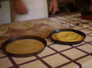 1台はカスタードクリームを、もう1台にはサクランボのジャムを広げます。