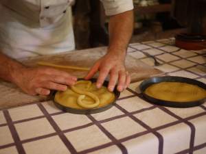 表面には格子状に模様を付けたものや、『ローブリューLauburu』*注1というバスクの十字架を描いたものなどがあり、その大きさは大小さまざまです。ローブリューを表面に描くことによって、この土地のお菓子である、ということを強調しているのだそうです。