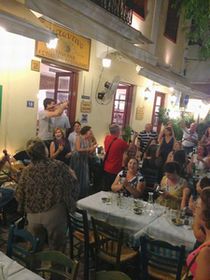 (左)アテネ、キダシネオン通りにあるお店で、歌って踊る陽気な人達