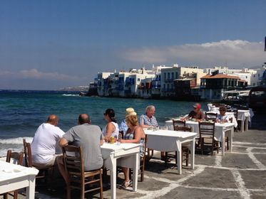 フランス料理のようなモダンなレストランはあまり見る事が無く、フランスでいえば庶民的な食堂であるビストロにあたる「タベルナ ταβερυα」が多くあります。アテネやミコノス島ではタベルナやバーが多く集まる通りもあり、観光客や地元の人々で賑わっていました。ギリシャの人々は特に夏、外食を好んで行ない、夕食であれば21時以降に食べる事が多いそうです。
