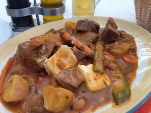子羊のお尻の肉を糸で巻き、形を整えて煮込む料理で、フランス料理のナヴァラン(子羊肉を玉ねぎやトマト、水で煮込んだ料理)を思い起こさせるものでした。店の人に聞いてみたところ、"ポリチコ" は家庭風にココット鍋(ふた付きの鋳物鍋)で火を通す、という意味があり、"ケフチコ" は「巻く」という意味があるそうです。