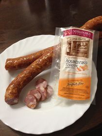 (右)スパルタ産のセミドライソーセージ。オレンジの皮が入っています
