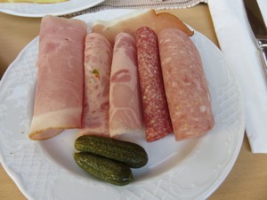 これはフェスパープラッテ Vesperplatte(ハム&ソーセージの盛り合わせ)といって、フェスパー(午後から夕方にかけての軽食)として、良く食べられるものです。朝食で提供されるハム・ソーセージ類と比較すると、血のソーセージや生ハム、サラミ系など日持ちのするスモークの利いた味の濃いものが多いようです。