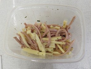 (右)ソーセージを細切りにしてチーズと合わせたサラダなど、持ち帰り可能な惣菜もあります