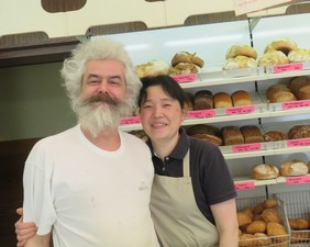 (右)焼き立てパンとキッチンを提供していただいたコッホス夫妻