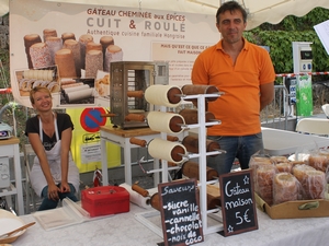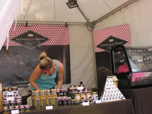 町の中心部に足を踏み入れると、早くも大変な人出。生産者による販売ブースがずらりと並びます。地元の南仏だけでなくフランス全土からの特産品、さらには外国からの出店も多数あり、珍しいものばかりで目移りしてしまいます。