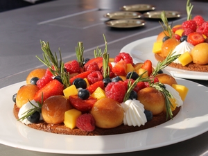 (右)たっぷりとお酒を浸み込ませたプティ・サバランを色とりどりのフルーツとクリームで仕上げ