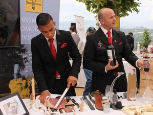 (左)生ハムのスライスやワインのテイスティングをデモンストレーションしています