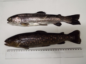 同じマスなのに、大きな違いを見ることが出来ました。ニジマスのプールに人間が近づくと、食いしん坊のニジマスはエサをくれると思い暴れるように寄って来ますが、反対に警戒心の強いファリオは離れていきます。