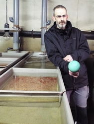 マスの養殖場はフランス全土に400か所ほどありますが、大規模な養殖場2か所を除いては少人数経営のところがほとんどだそうで、『ムーラン・ピア』もその一つです。ギヨーム・バゴ氏M. Guillaume Bagoはこの養殖場を、共同経営者のローラン・ブルジョワ氏M.Laurent Bourgeoisとたった2人ではじめました。この場所は元々川釣り専用のマスのみの養殖場でしたが、2007年に買い取り、食用のニジマス、ファリオの養殖を始めたそうです。
