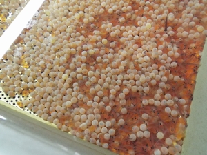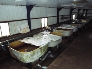 大きな養殖場だと照明や水の温度管理等が出来るため、年に数回孵化させることも出来るそうですが、こちらでは孵化は1年に1度、専門業者からニジマス5万個、ファリオ10万個の卵を仕入れて孵化をさせます。成魚の産卵から行おうとすると相当な水量と施設コストがかかるため、ここでは孵化から行っているそうです。