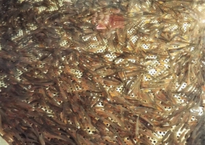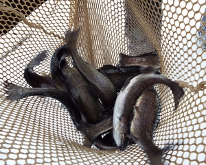 ニジマスもよく用いられ、フリチュール用に養殖の需要も大きいようです。通常、稚魚がエサを食べ始めれば屋外のプールへ移して成長させますが、フリチュール用のニジマスは屋内のプールで20gサイズまで成長させて出荷します。5~7月にかけてが旬で、9月ぐらいまで出回る期間限定商品になります。