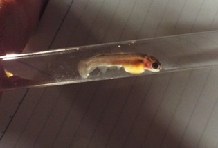 稚魚のお腹にあるものはヴィテリュス vitellus、もしくはヴェジキュル vésicule(注3)というらしく、孵化して3週間の間の栄養分です。ヴィテリュスがなくなってくれば、照明で室内を明るくして少しずつエサに慣れさせます。