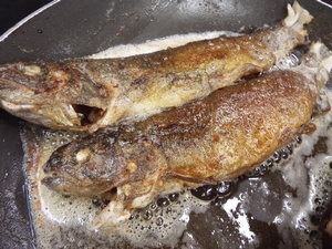 通常は魚を〆てから調理するまでに1日程度置かないと、身が締まりすぎていて調理中に破裂するのですが、今回はより鮮度が良いものを食するためにすぐにムニエルにしました。身が活かっているため、破裂しましたが新鮮な証拠です。