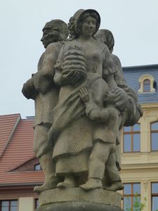 次に訪れたのは、ブランデンブルグ Brandenburg州にある町コットブスです。すぐ東がポーランドということもあって、町にはドイツ語とポーランド語2つの標識があります。町の広場に噴水があり、見上げてみると漁師と子供、そしてバウムクーヘンを持った女性の像が。