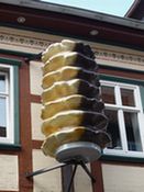 ザルツヴェーデルにはバウムクーヘンの有名なお店が2軒あります。1軒目は1842年創業の『カフェ・クルーゼ Café Kruze』です。バウムクーヘン以外のお菓子も豊富で、カフェも併設されています。中庭の席の近くには、高さ2メートルほどの、バウムクーヘンクイズのパネルがあります。バウムクーヘンの形をした金属のパネルに、バウムクーヘンに関する問題が14問ほど列記してあり、それぞれ問題部分をめくると、解答が分かるようになっています。