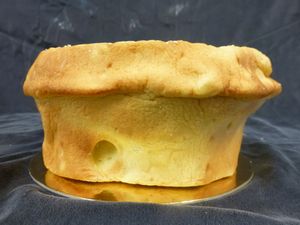 コットブス風バウムクーヘンは、卵黄と卵白を分けて泡立てる、別立て法で作られています。他のバウムクーヘンとの大きな違いは、バターの割合が多く、フラワーバッター法(注9)で作成されることです。マジパン又はアーモンドパウダー、シナモン、カルダモン、メース、クローブといった様々な香辛料が入るのも特徴の一つです。
