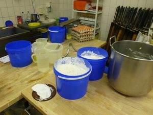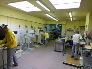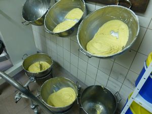 バウムクーヘンの大きな窯が2台と、計量スペース、大型ミキサーが設置されています。材料は女性の従業員が手際よく準備していきます。