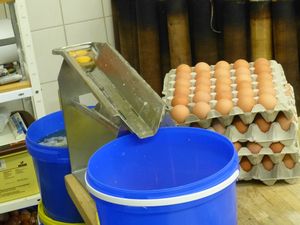(右)割卵器。自動的に卵黄と卵白に分かれていきます