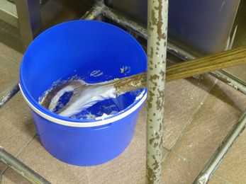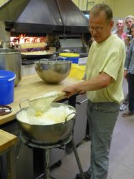 中心に穴の開いた大きな木杓子で混ぜ合わせ、バウムクーヘン焼成機へと移されます。