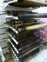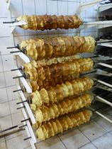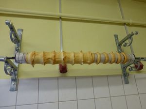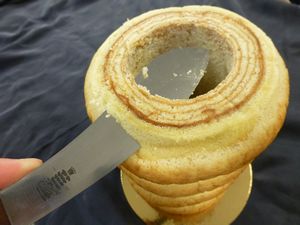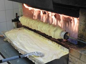この町のバウムクーヘンは、コットブスのものと同様に別立て法で作られ、3つのタイプの中でも、一番基本の配合に近いシンプルなものです。特徴的なのはその形で、他の2つの町のものは、一層ずつ生地に浸しては、専用のへらで形を整えながら焼いていきます。それに対し、ザルツヴェーデル風バウムクーヘンは、生地をかけながら形は整えずに焼いていきます。