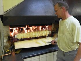 もちろん、1本焼いて終わりではありません。この作業を朝から昼過ぎまでずっと続けていきます。ザルツヴェーデル風バウムクーヘンは、生地に浸すのではなく、職人さんが炎のそばで、生地をかけながら焼いているのです。