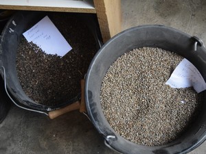 (左)左のバケツが中国産の輸入ソバ。右がブルターニュ原産