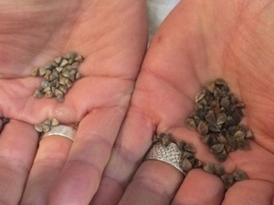 ブルターニュ原産のラ・アルプ種と中国産のソバを比較してみると、ブルターニュ産のほうが小粒で、色も淡く銀色がかっていました。見た目からも繊細な感じが伝わってきます。