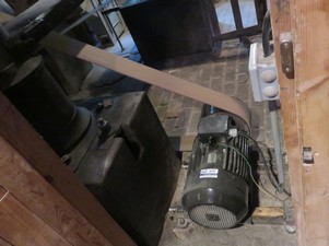 (右)布製のベルトが1階のモーターと各階の機械をつなぎ、各階に動力を送っています