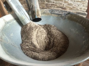 2度目の粉砕でも十分な粒子にならなかったものは、再度2つ目の石臼に送られ、この作業を何度も繰り返します。最終的には、複数の質の違うソバ粉の袋ができあがります。