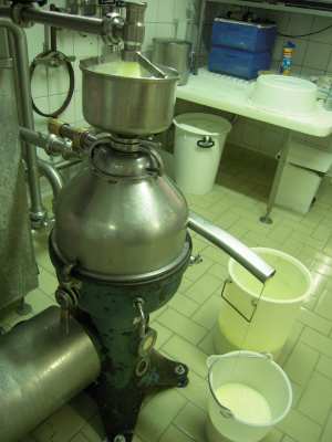 牛乳から部分的に乳脂肪分を取り除き、大きな銅鍋で30℃に加熱し、30分間放置して醗酵。