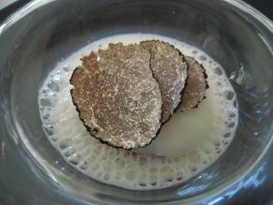 コンテのクリーミーなソースの中にはほうれん草のソテー、温泉卵、表面にはトリュフ。