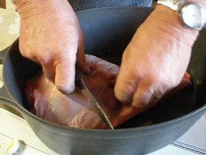① ナイフで肉に小さな穴を開け、ニンニクを押し込んでいきます。