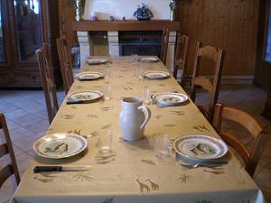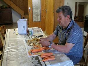 ここからすべてのお料理はご主人のジャンさんが作ります。いつもの夕食はマリーさんがされていたのに、今回は何故?とうかがうと、「当然よ、お肉をさばくお料理は男の仕事。女はお客さんを楽しませるのが仕事!」とのこと。「昔は男手が家畜を屠畜して切り分け、料理まですることが多く、その習慣から、お祝いのお料理や特別なお料理は男の人がするのよ。」とおっしゃっていました。