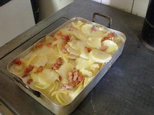③ 肉を焼いている間に付け合せの野菜の処理。今回はジャガイモのグラタンです。