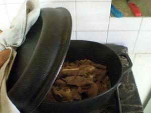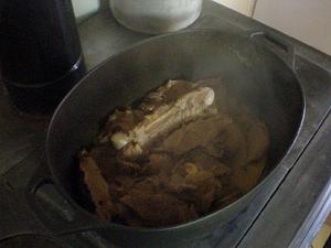 ④ オーブンの上で蒸し焼きにした肉を良い大きさにざっくり切って、水を足しさらに煮込んでいきます。