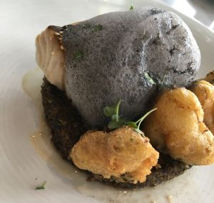 この日の昼のメニューは黒米のクリーム、シロイトダラのポワレ