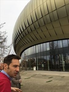 (左)先進的な建築物としての説明をしてくださるピエール氏