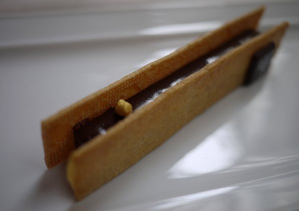 私が印象深いものはタルトのお菓子で、タルト生地を土台に敷いた通常の素朴な形ではなく、タルト生地で中身のクリームを挟んでいるものです。パティスリーでタルトといえば通常の形で作ってしまいますが、ここはレストランでもデセールとして提供している洗練されたデザインが目をひきました。構造上、生地の部分が普通のタルトよりも多くなってしまいますが、クリームがしっかりした味のためちょうど良いバランスでした。