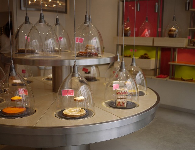 お菓子の売り場も、ただショーケースに並べるだけではなく、斬新な展示方法を提案する店も増えてきました。例えば「ユーゴ・エ・ヴィクトールHUGO&VICTOR」(写真下左)のように使っている材料別に展示を変えたり、「ラ・パティスリー・デ・レ-ヴLa Pâtisserie DES RÈVES」(写真下右)のように、見本になるものを1つ置いておき、注文があれば裏からとってくるというシステムを使用しているお店もあります。