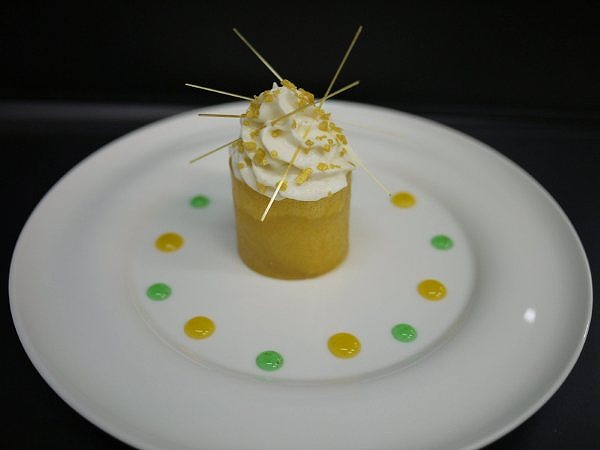 本来のババは、ラム酒がふんだんに生地に浸み込んだ重厚な味のお菓子。ですが、ショセス氏の手にかかると、ババ本来の特徴は備えつつも、サイフォン(液体をムース状にしてだす器具)で作られた軽いラム酒のクリームと柚子のソルベの風味が良く、バランスの取れた全く新しい一品となります。