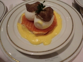右)エッグ・ベネディクト:トリュフのスライスがのせられていて、ソースはサーヴィスマンがお客の前で熱々のものをかけてくれます。